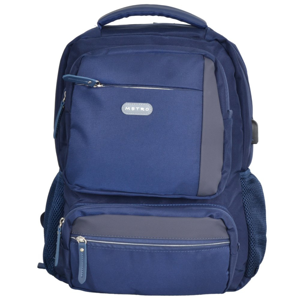 Batoh z kolekce METRO je ideálním batohem pro každodenní použití, nabízí dostatek místa pro knihy, dokumenty (A4) a notebook.Pohodlné nastavitelné ramenní popruhy v kombinaci s polstrovanými zády zajišťují maximální pohodlí při nošení. Batoh má jeden hlavní prostor, na přední straně čtyři menší kapsy a kapsy na bocích vhodné např. pro láhev, skladací deštník. Uvnitř batohu je polstrovaný úložný prostor pro notebook. Batoh je vybaven speciálním popruhem na zadní straně, díky němuž ho můžete připevnit přes výsuvné madlo kufru.Batoh je vybaven vestavěným USB nabíjecím portem na vnější straně, takže můžete snadno nabíjet svá mobilní zařízení na cestách. Jednoduše vložte svůj vlastní powerpack do vnitřní kapsy (powerpack není součástí dodávky) a pomocí dodaného USB kabelu jej připojte k portu. K nabíjení zařízení pak můžete použít vlastní nabíjecí kabel, aniž byste museli po kapsách tahat těžký powerpack. • materiál: polyester• rozměr: 43 x 34 x 20 cm• objem: 29 l• hmotnost: 0,60 kg• doporučená nosnost 8 kg• polstrovaná kapsa na notebook• nastavitelné polstrované ramenní popruhy• polstrovaná záda