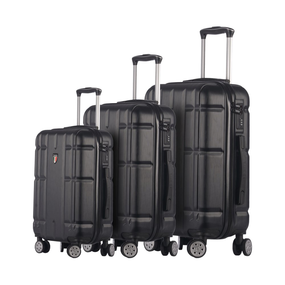Sada cestovních kufrů z kolekce TUCCI Massa.Kufry jsou uzavíratelné zipem. Jezdce zipu se dají zapojit do zapuštěného kódového zámku. Horní i boční madla jsou plastová. U kufrů, kromě nejmenší velikosti S, lze pomocí druhého zipu zvětšit vnitřní objem.Celý pojízdný systém je umístěn uvnitř kufru pod textilní podšívkou, aby nedošlo k poškození systému při přepravě a je opatřen čtyřmi dvojitými kolečky otočnými o 360°. Kufry mají lehký výsuvný systém, vnitřní přepážku a jistící popruhy. Cena je uvedena za 3ks sadu zobrazené velikosti L / M / S. • velikost L (large) / M (medium) / S (small)• materiál: ABS HARDSEHLL - flexibilní, lehký, odolný proti poškrábání• ergonomická gelová rukojeť(madlo)• vnitřní rozměr: 75 x 50 x 33 cm / 65 x 43 x 29 cm / 49 x 34 x 20 cm• vnější rozměr: 82 x 54 x 34 cm / 73 x 47 x 30 cm / 57 x 38 x 21 cm = rozměry kufru včetně koleček a horního madla• objem: 124 l / 81 l + 35% expander / 33 l• rozšiřitelný – objem lze zvětšit až o 35%• hmotnost: 5 kg / 4,4 kg / 2,8 kg• doporučená nosnost 25 kg / 20 kg / 10 kg• výsuvný systém (u nejmenší velikosti S je teleskopický)• 4 dvojitá kola pro velký komfort při užívání otočná o 360°• kódový zámek• 10-ti letá záruka